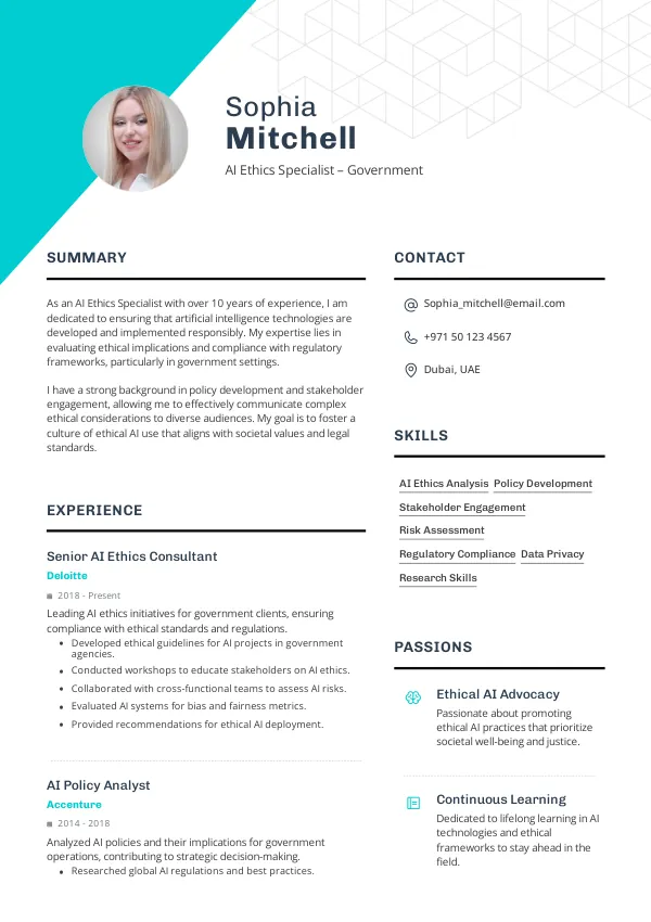 The demand for AI Ethics Specialists in the UAE indicates a stable career outlook, with many employers actively seeking talent to fill these roles. The government's commitment to ethical AI practices supports long-term job security in this field. A TrueCV-optimized resume can enhance your employability by clearly demonstrating your qualifications and readiness for this growing market.