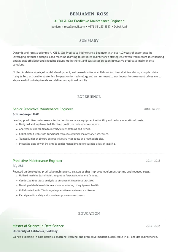 Resume Examples for AI Oil & Gas Predictive Maintenance Engineers