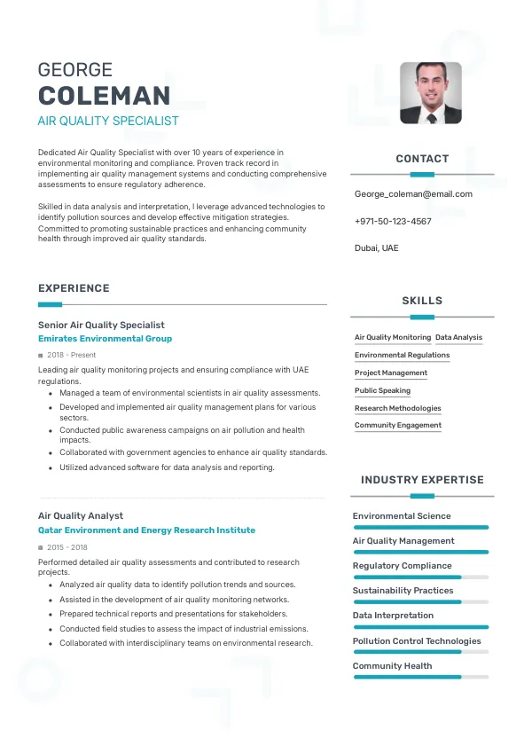 The demand for Air Quality Specialists is expected to provide strong career stability in 2026, particularly in the UAE, where environmental initiatives are a priority. This stability is further supported by the government's commitment to sustainability and public health. Candidates should emphasize their adaptability and commitment to ongoing education in their resumes, which TrueCV can help optimize.