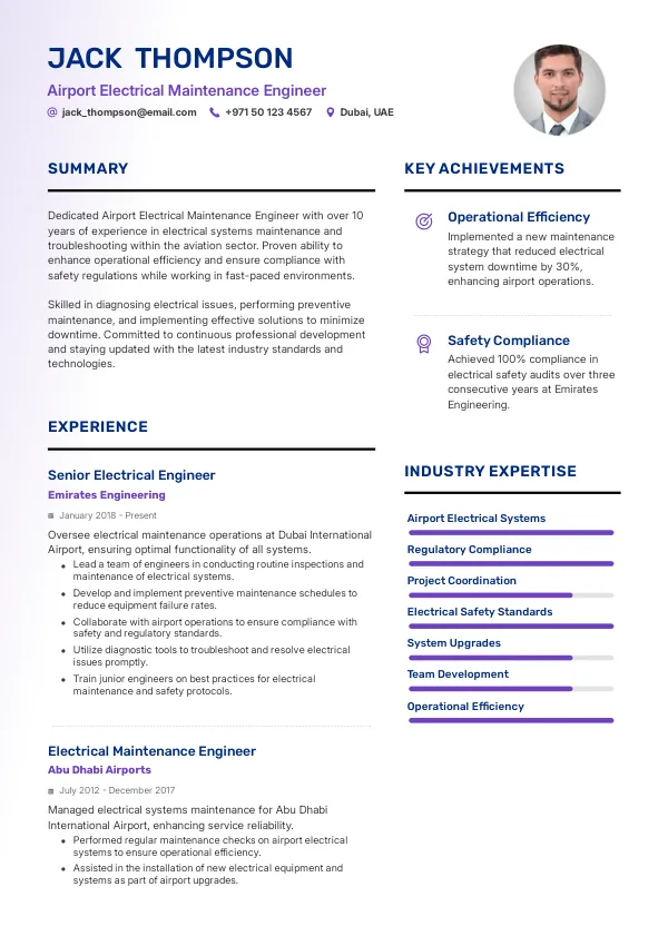 The UAE's investment in airport infrastructure and renewable energy projects signals strong career stability for Airport Electrical Maintenance Engineers in 2026. The ongoing demand for skilled professionals in this sector will facilitate visa opportunities for international candidates. A TrueCV can assist candidates in presenting their qualifications effectively to potential employers.