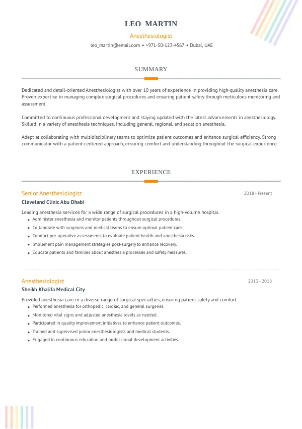 Resume Examples for Anesthesiologists