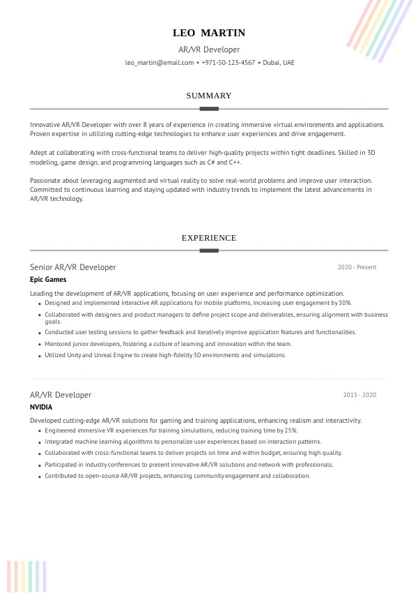 Resume Examples for AR/VR Developers