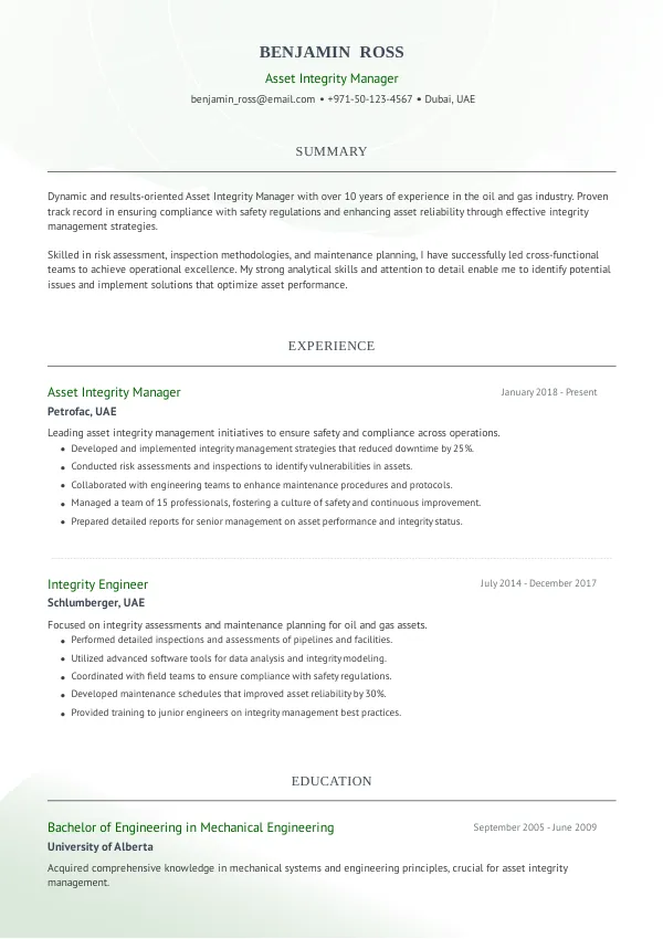 Resume Examples for Asset Integrity Managers