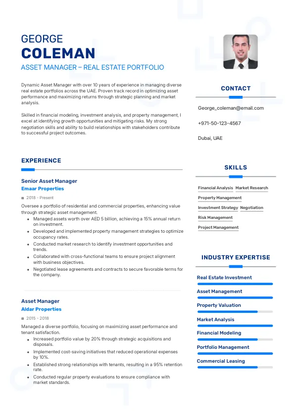 In 2026, the role of Asset Managers in the real estate portfolio sector of the UAE has evolved significantly. With the integration of AI-driven analytics and blockchain technology, Asset Managers are now expected to leverage advanced data insights for strategic decision-making. This evolution necessitates a TrueCV-optimized resume that highlights adaptability to new technologies and methodologies.