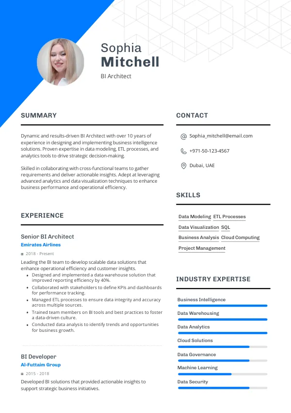 As the role of BI Architect becomes more complex, employers will increasingly seek candidates with advanced certifications in data analytics, cloud computing, and AI technologies. Certifications such as Certified Business Intelligence Professional (CBIP) and Google Cloud Professional Data Engineer will become more relevant. Aligning your qualifications with these expectations in your TrueCV can set you apart in a competitive job market.