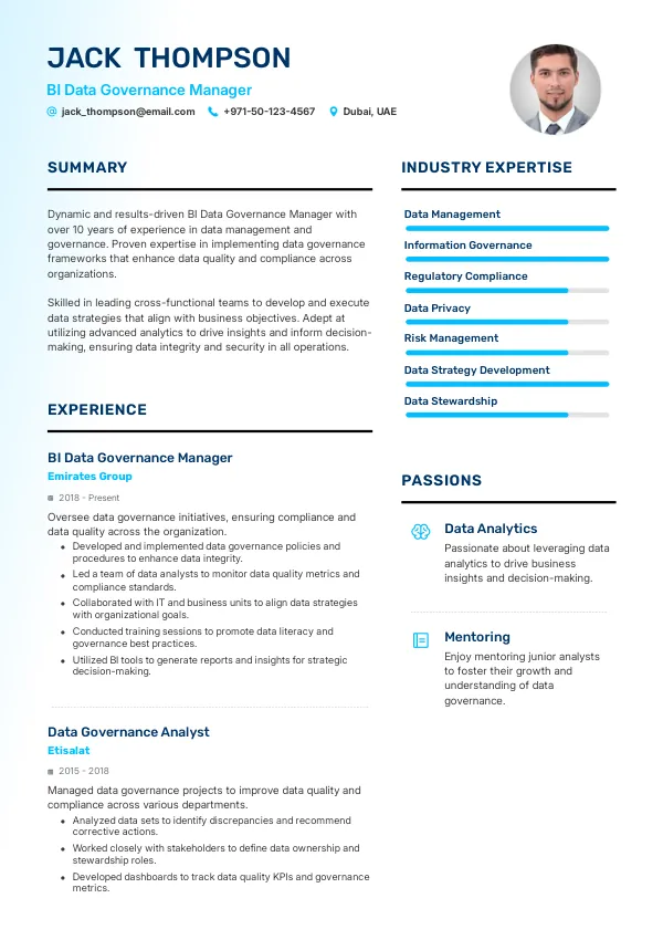 The UAE's commitment to becoming a data-driven economy will enhance job stability for BI Data Governance Managers. As companies invest in data governance, the likelihood of securing long-term positions increases. TrueCV can help you present a compelling case for your employability in this thriving market.