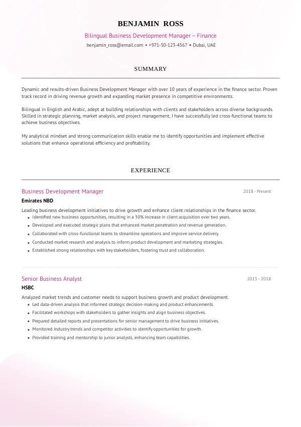 Leading finance firms such as Emirates NBD, Abu Dhabi Commercial Bank, and Dubai Islamic Bank are ramping up hiring for Bilingual Business Development Managers in 2026. These organizations recognize the value of bilingual professionals in driving growth and expanding their market reach. A TrueCV-optimized resume can help you align your skills with the specific needs of these employers.