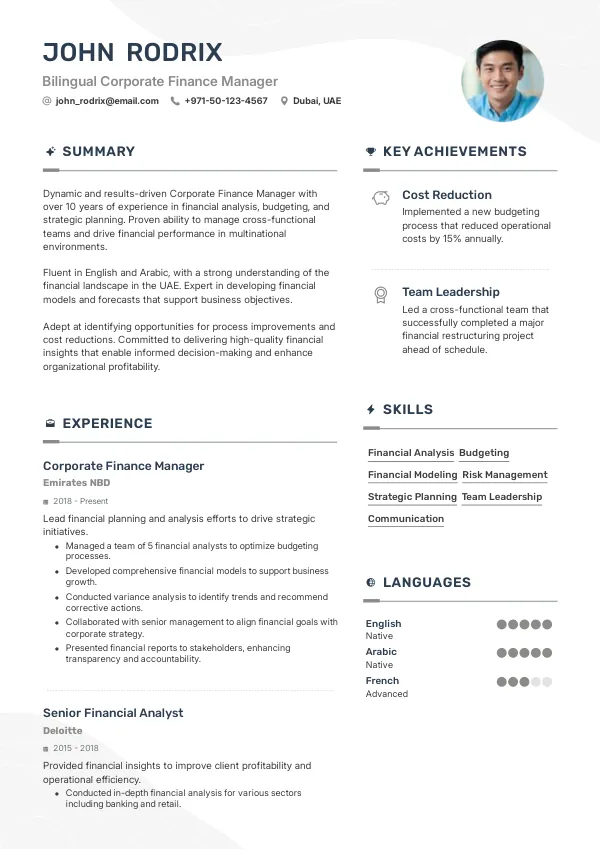 The UAE's ongoing investment in financial services and infrastructure will provide a stable job market for Bilingual Corporate Finance Managers in 2026. Companies are increasingly seeking skilled professionals who can adapt to changing regulations and market dynamics. This stability is a key factor for candidates considering long-term career prospects in the region. A well-crafted TrueCV resume will enhance employability by showcasing adaptability and relevant experience.