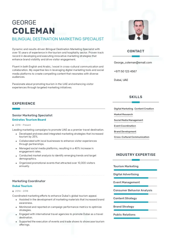 In 2026, the role of Bilingual Destination Marketing Specialist will evolve significantly, driven by advancements in digital marketing technologies and the increasing importance of personalized travel experiences. As the UAE continues to position itself as a premier travel destination, specialists will need to leverage new platforms like AI-driven marketing tools and data analytics to craft targeted campaigns. A TrueCV-optimized resume will highlight your adaptability to these changes, showcasing your readiness for this dynamic role.