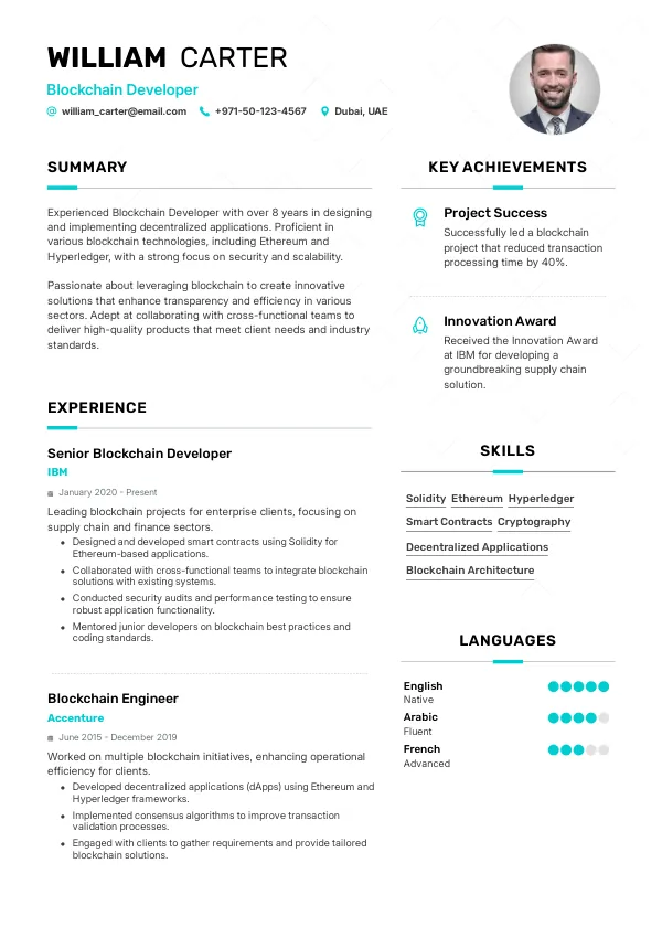 The UAE's commitment to becoming a blockchain leader provides a stable career outlook for Blockchain Developers. The government's support for tech talent and favorable visa regulations contribute to a robust job market.