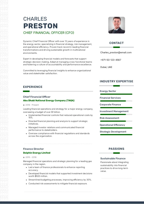 Leading organizations such as Abu Dhabi National Oil Company (ADNOC), Dubai Electricity and Water Authority (DEWA), and Masdar are actively seeking CFOs to lead their financial strategies in the energy transition. These employers are looking for candidates who can navigate the complexities of the energy market while ensuring compliance with new regulations. A TrueCV-optimized resume can help you align your experience with the specific needs of these top employers.
