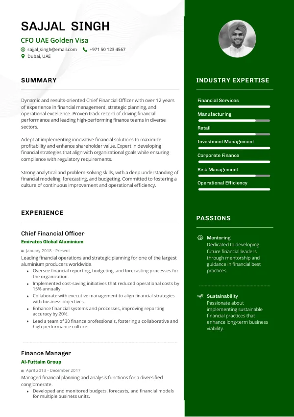 Under the UAE Golden Visa, CFO roles are highly sought after, making you eligible for this long-term residency option. A Truecv-crafted resume will showcase your skills and qualifications, significantly enhancing your chances of visa approval and job placement.