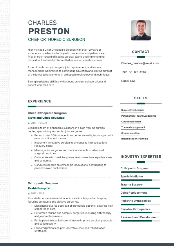 The role of Chief Orthopedic Surgeon in 2026 is evolving with advancements in robotic-assisted surgery and telemedicine. These innovations enhance surgical precision and patient care, making this role increasingly critical. A well-crafted resume can highlight your seniority and contributions effectively, aligning with the expectations of employers seeking candidates for long-term residency options like the Golden Visa.