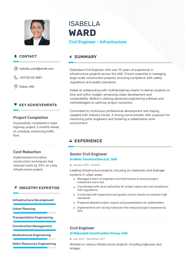 In 2026, the role of Civil Engineers in Infrastructure will expand significantly, incorporating advanced technologies such as AI-driven design tools and smart infrastructure systems. As urbanization accelerates in the UAE, engineers will be expected to integrate sustainability practices into their projects. A TrueCV-optimized resume can help highlight these evolving competencies, making candidates stand out in a competitive job market.