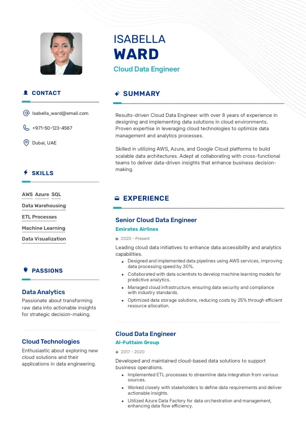 - Achievement: Successfully designed and implemented a cloud-based data pipeline that improved data processing speed by 30%.