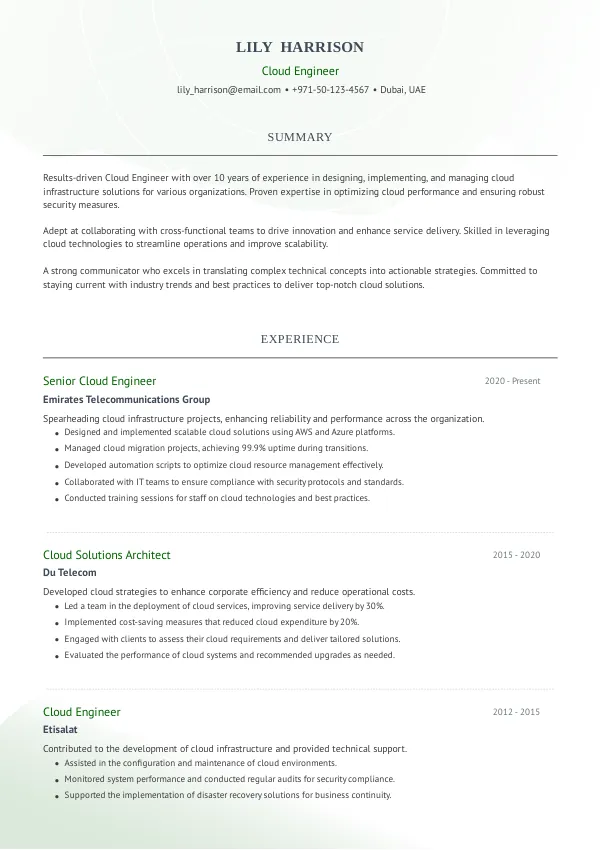 Truecv specializes in crafting resumes for Cloud Engineers in the UAE, ensuring they meet local market standards and ATS requirements.