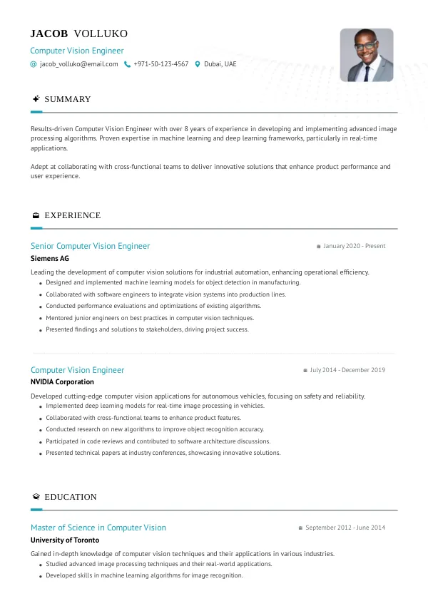 In 2026, the role of a Computer Vision Engineer is evolving significantly due to advancements in AI technologies and machine learning frameworks. This role now requires a deeper understanding of neural networks and image processing algorithms, which are becoming standard in the industry. A well-crafted resume that highlights these competencies can enhance seniority signaling and visibility of contributions, aligning with Golden Visa considerations for long-term residency.