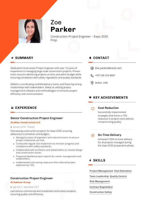 With the upcoming Expo 2030, there is a surge in demand for Construction Project Engineers due to increased infrastructure investments and regulatory compliance requirements. The UAE government is implementing new standards for sustainable construction, driving the need for skilled professionals who can navigate these changes. A TrueCV-optimized resume will help you stand out in this competitive market.