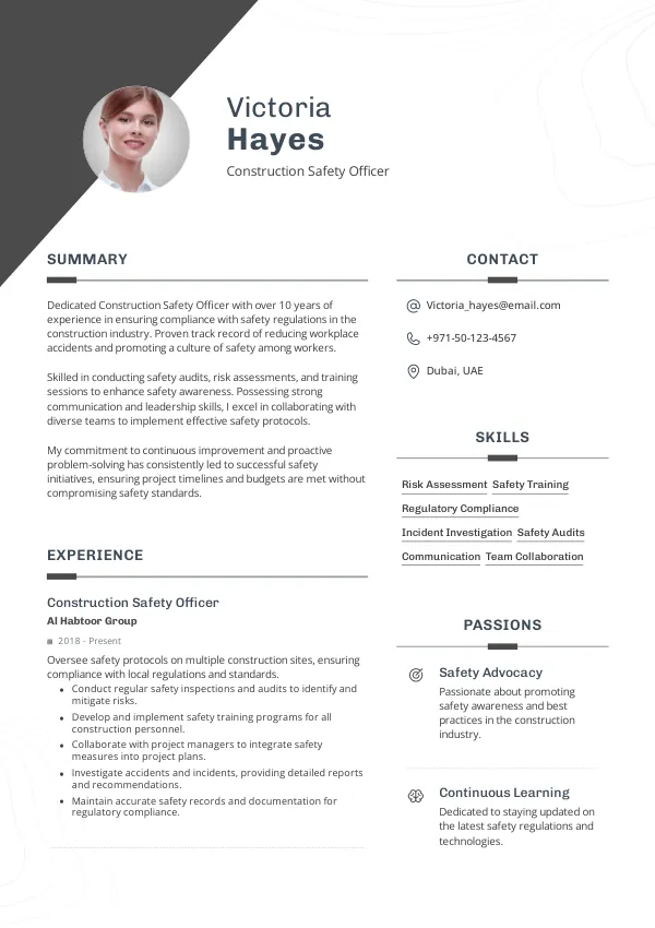 Leading construction firms such as Arabtec, Al Habtoor Group, and ACC are expected to increase their hiring of Construction Safety Officers in 2026. These companies are investing in advanced safety technologies and require professionals who can ensure compliance with new regulations. A TrueCV-optimized resume can help you connect with these employers by showcasing your relevant experience and skills.