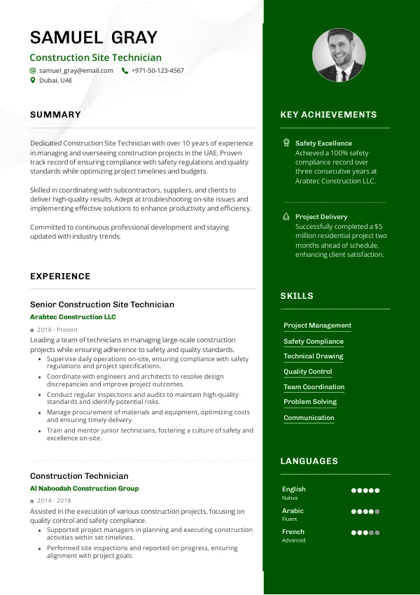 In 2026, the role of the Construction Site Technician in the UAE will evolve significantly, focusing on advanced project management and integration of smart construction technologies. The adoption of Building Information Modeling (BIM) and augmented reality (AR) will redefine site operations, requiring technicians to possess a blend of technical and digital skills. A TrueCV-optimized resume will help candidates highlight these essential skills and align with evolving employer expectations.