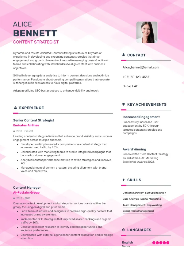 Leading companies in the UAE's Creative Arts sector, such as Dubai Media City, Abu Dhabi Film Commission, and Emirates Airlines, are ramping up their hiring of Content Strategists. These organizations recognize the importance of innovative content strategies in enhancing their brand presence and engaging audiences. Candidates should tailor their TrueCV resumes to align with the specific needs of these employers.