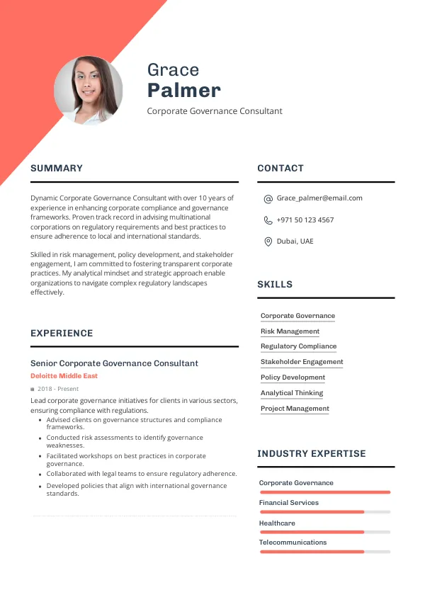The UAE's focus on attracting global talent in the consulting sector will enhance career stability for Corporate Governance Consultants in 2026. With ongoing investments in regulatory frameworks, the demand for skilled professionals will remain strong. A TrueCV-optimized resume will help you navigate visa requirements and demonstrate your qualifications effectively.