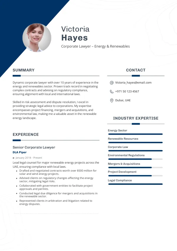 In 2026, the role of Corporate Lawyer specializing in Energy & Renewables in the UAE will expand significantly, driven by the increasing complexity of energy regulations and sustainability initiatives. As the UAE continues to invest heavily in renewable energy projects, the legal landscape will require lawyers to navigate new compliance frameworks and international agreements. A TrueCV-optimized resume will help candidates highlight their adaptability to these evolving legal requirements.