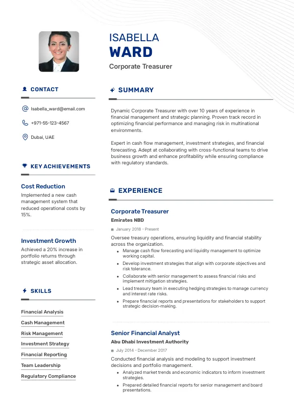 Prepare for your future as a Corporate Treasurer in 2026 with a resume that highlights your seniority and economic contributions, supporting your long-term residency and Golden Visa aspirations.