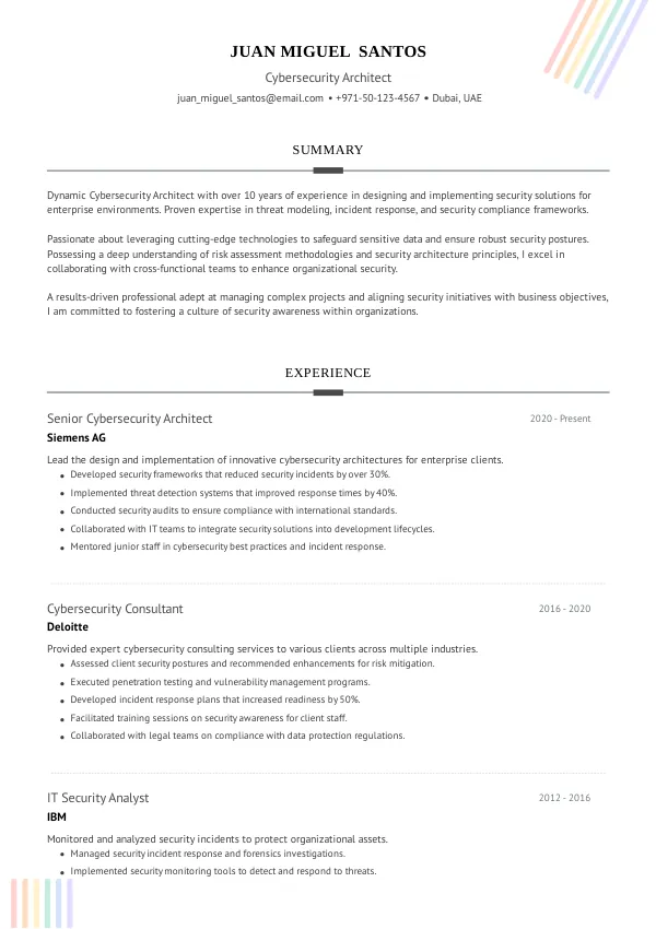 - Create UAE-compliant Cybersecurity Architect resumes aligned with Golden Visa requirements.