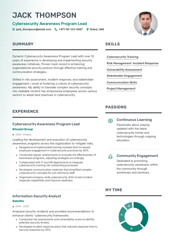 The cybersecurity sector is experiencing robust growth in the UAE, leading to stable employment opportunities for Cybersecurity Awareness Program Leads. The government's commitment to enhancing national cybersecurity infrastructure further supports job security. A TrueCV-optimized resume can enhance your visibility to employers, increasing your chances of securing a stable position in this thriving market.