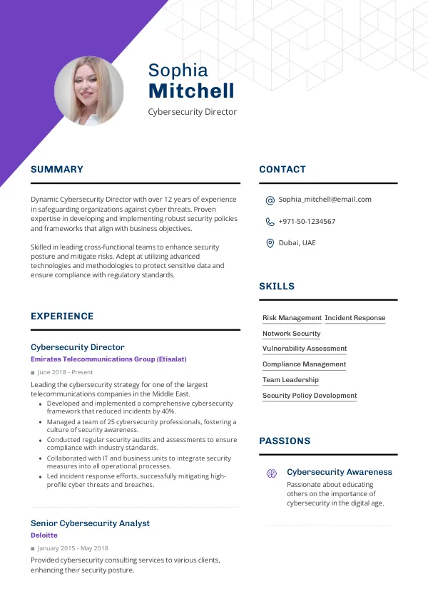 - Achievement: Led the implementation of an AI-driven security framework, resulting in a 30% reduction in security incidents, showcasing impact and alignment with long-term residency / Golden Visa considerations.
