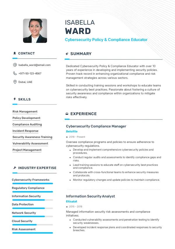 The cybersecurity education sector in the UAE is expected to remain stable, with continuous hiring due to the increasing focus on compliance and security. As organizations prioritize cybersecurity training, the demand for qualified educators will remain strong. Candidates can enhance their employability by presenting a TrueCV-optimized resume that aligns with the current market trends and expectations.