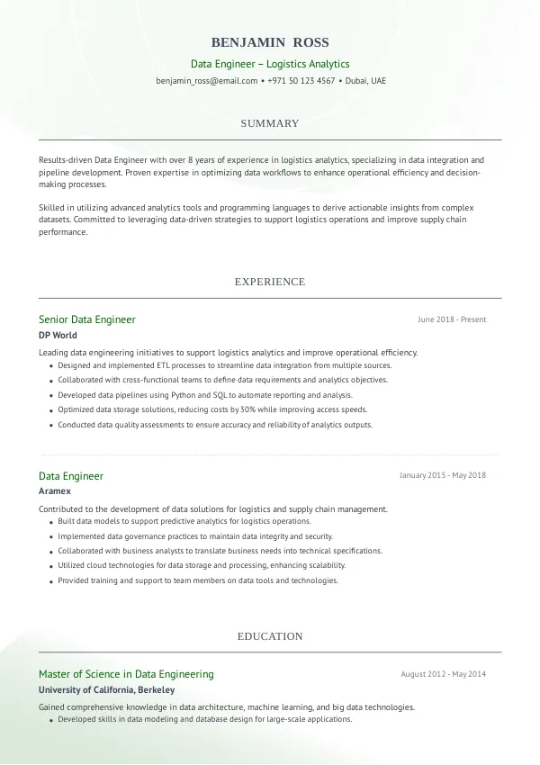 In 2026, the logistics analytics sector is projected to experience robust growth, leading to increased job stability for Data Engineers. This role is commonly aligned with long-term residency and Golden Visa consideration due to its strategic importance in driving economic growth. A well-positioned resume that highlights your career stability and contributions can enhance your chances of being viewed favorably in Golden Visa evaluations.