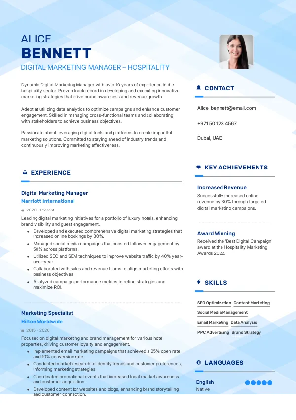 In 2026, the role of Digital Marketing Manager in the hospitality sector will evolve significantly, driven by advancements in AI-driven marketing tools and customer engagement platforms. The integration of augmented reality (AR) in marketing strategies will redefine how hospitality brands connect with their audiences. A TrueCV-optimized resume will help candidates highlight their adaptability to these changes and showcase relevant experiences.