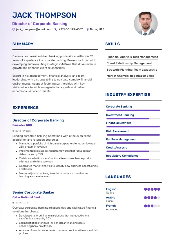 Leading banks and financial institutions in the UAE, such as Emirates NBD, Abu Dhabi Commercial Bank, and First Abu Dhabi Bank, will be actively seeking Directors of Corporate Banking to drive their strategic initiatives. These employers will prioritize candidates who demonstrate a strong understanding of digital banking trends, making a TrueCV-optimized resume essential for standing out.