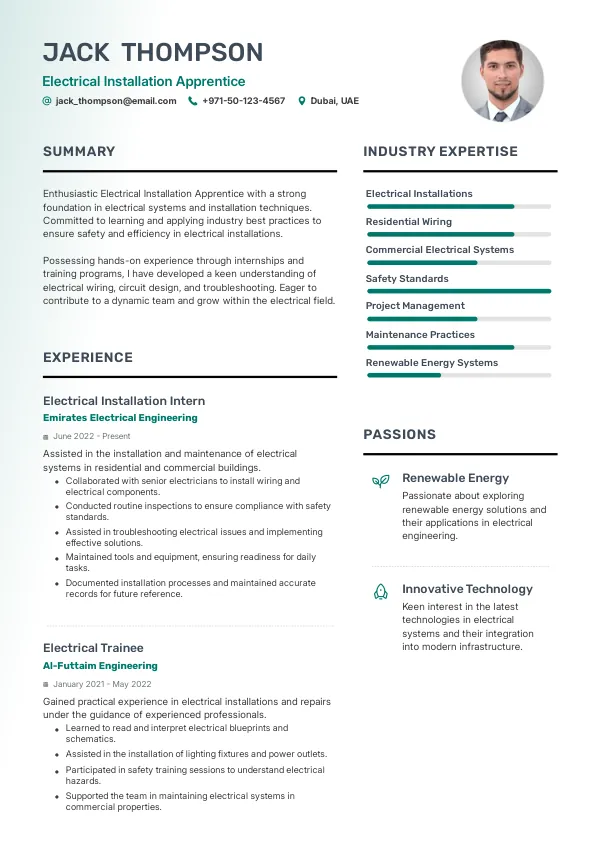 In 2026, the role of Electrical Installation Apprentice in the UAE will evolve significantly due to advancements in smart building technologies and renewable energy systems. As construction projects increasingly integrate IoT devices and energy-efficient solutions, apprentices will be expected to adapt to these innovations. A TrueCV-optimized resume can highlight your readiness for these changes, making you a more attractive candidate.