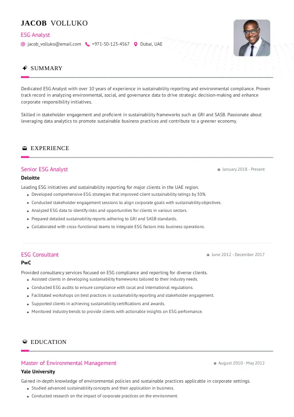- Achievement: Developed a comprehensive ESG strategy that improved sustainability metrics by 30%, demonstrating significant impact and aligning with long-term residency and Golden Visa considerations.
