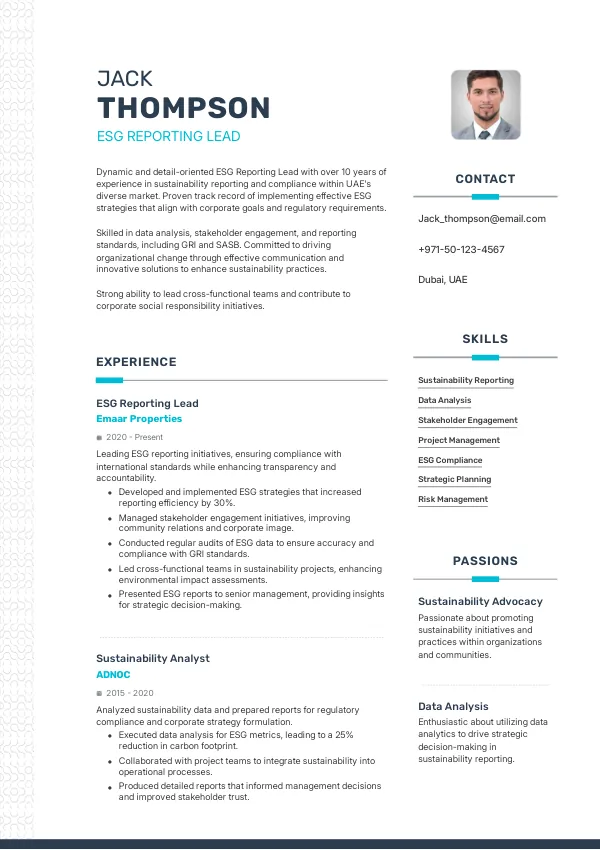 Get a professional ESG Reporting Lead resume tailored to your skills and today’s hiring trends.