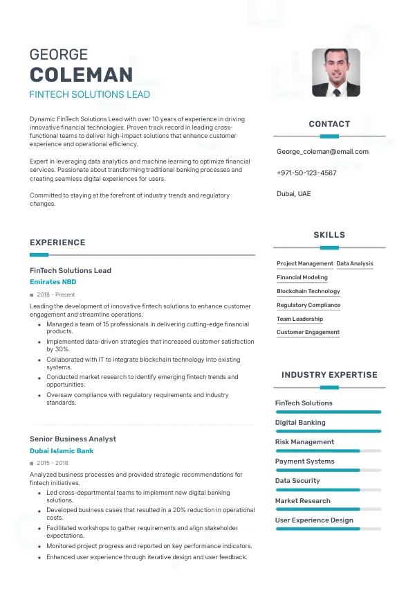Resume Examples for FinTech Solutions Lead