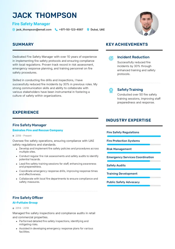 - Achievement: Successfully implemented a new fire safety management system that reduced incident response time by 30%.