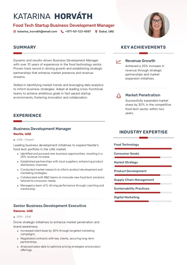 In 2026, the role of Business Development Manager in the Food Tech industry will expand significantly, integrating advanced data analytics and AI-driven market insights to inform strategic decisions. This evolution will require professionals to adapt to new terminologies such as 'Agile Food Innovation' and 'Sustainable Supply Chain Management'. A TrueCV-optimized resume will help candidates highlight their adaptability and alignment with these emerging trends.
