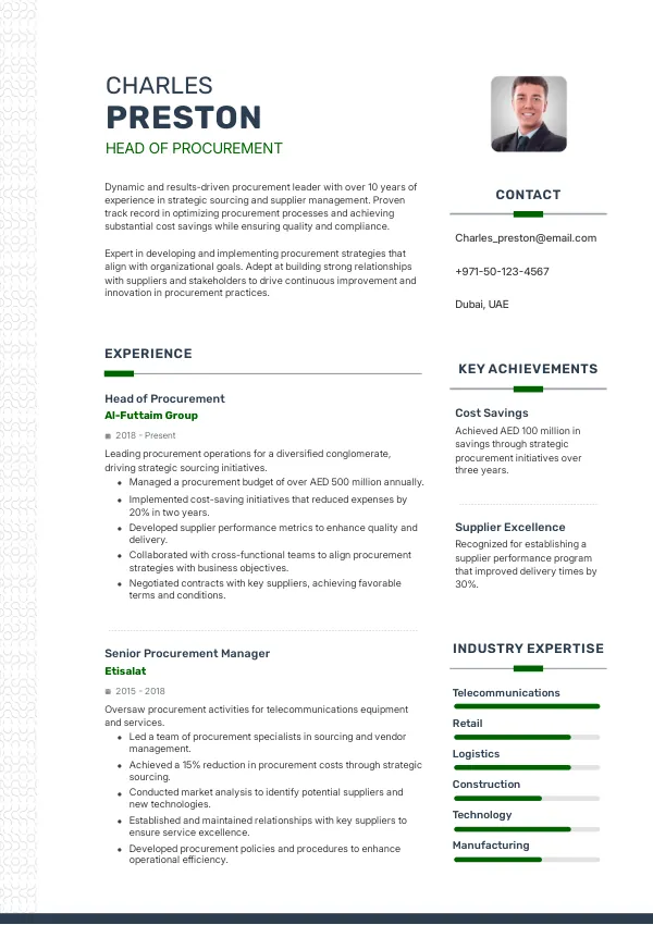 The UAE market is projected to maintain a strong demand for procurement professionals, ensuring career stability for Heads of Procurement. As companies expand their operations, the need for skilled leaders will remain high. A TrueCV can help candidates navigate visa applications by showcasing their qualifications and experience in alignment with market needs.