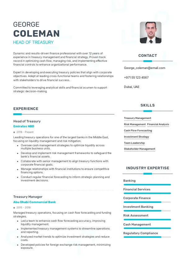 In 2026, the Head of Treasury role in the UAE's banking and finance sector is set to evolve significantly. With the integration of advanced financial technologies such as AI-driven analytics and blockchain for transaction security, the responsibilities will expand to include strategic decision-making based on real-time data insights. This shift necessitates a TrueCV-optimized resume that highlights adaptability to these technological advancements.
