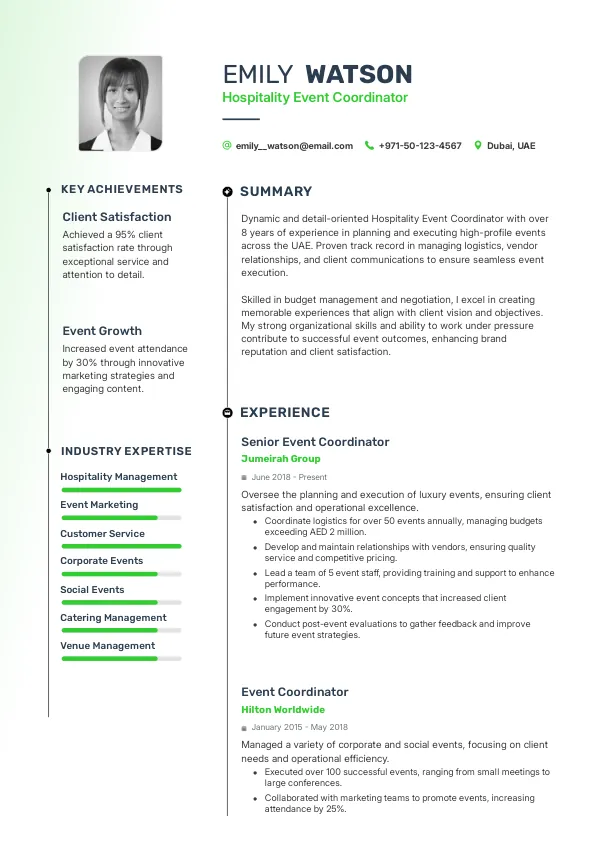 The UAE's commitment to hosting international events ensures a stable job market for Hospitality Event Coordinators in 2026. Employers will prioritize candidates with a strong understanding of the local regulations and cultural nuances. A TrueCV-optimized resume can emphasize your local expertise, enhancing your employability.