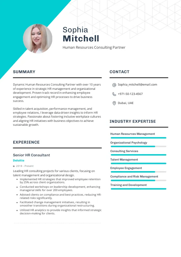 With the UAE's commitment to enhancing its labor market through regulatory reforms, the demand for skilled Human Resources Consulting Partners will remain strong, ensuring career stability. Employers are increasingly looking for international talent, which opens up visa opportunities for qualified candidates. A TrueCV-optimized resume can effectively highlight your international experience and adaptability, making you a desirable candidate in this evolving market.