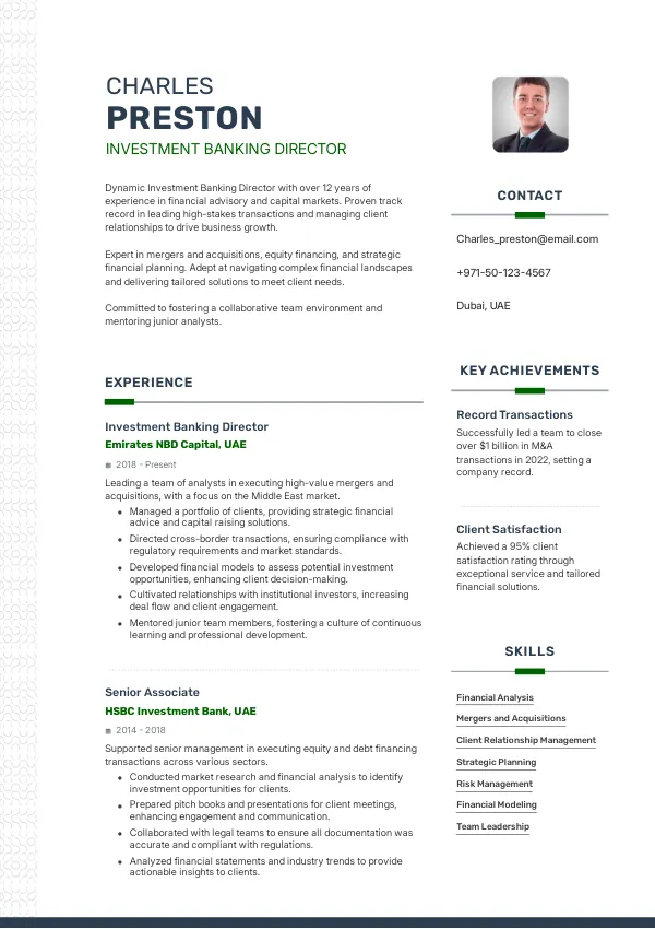 - Achievement: Led a team in implementing AI-driven financial strategies, resulting in a 30% increase in client investments, a metric that supports long-term residency and Golden Visa considerations.