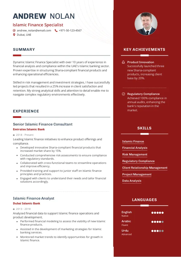 In 2026, the role of an Islamic Finance Specialist evolves significantly, driven by advancements in fintech and regulatory frameworks aimed at enhancing Sharia-compliant financial products. As the UAE continues to position itself as a global hub for Islamic finance, professionals in this field will be increasingly sought after. A well-crafted resume that highlights your expertise can enhance your seniority signaling and visibility of your contributions, aligning with Golden Visa evaluation perceptions.
