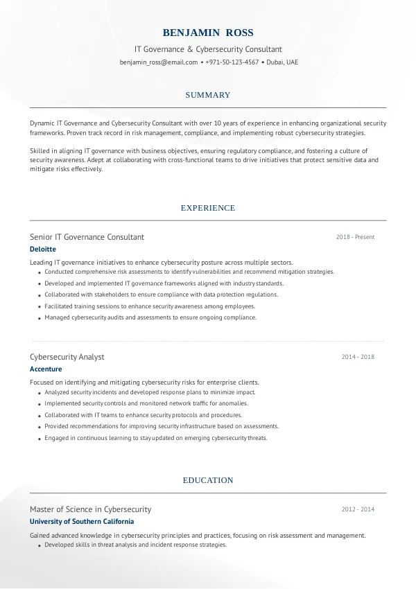 Resume Examples for IT Governance & Cybersecurity Consultants