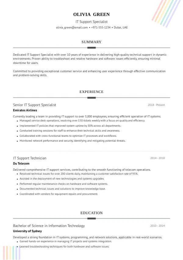 In a competitive job market like the UAE, having a standout resume is crucial for IT Support Specialists. Truecv specializes in crafting resumes that highlight your unique skills and experiences.
