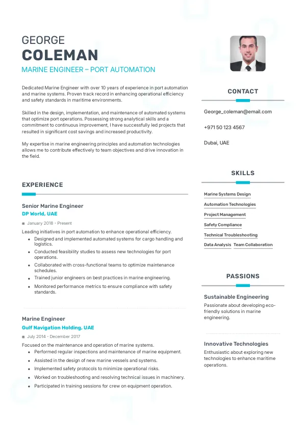 In 2026, the role of Marine Engineer is significantly transformed by the rise of port automation technologies, such as autonomous vessels and AI-driven logistics systems. These advancements require engineers to not only maintain traditional marine systems but also to integrate and optimize automated processes. A TrueCV-optimized resume can highlight your adaptability and technical skills, aligning with the evolving expectations of employers.